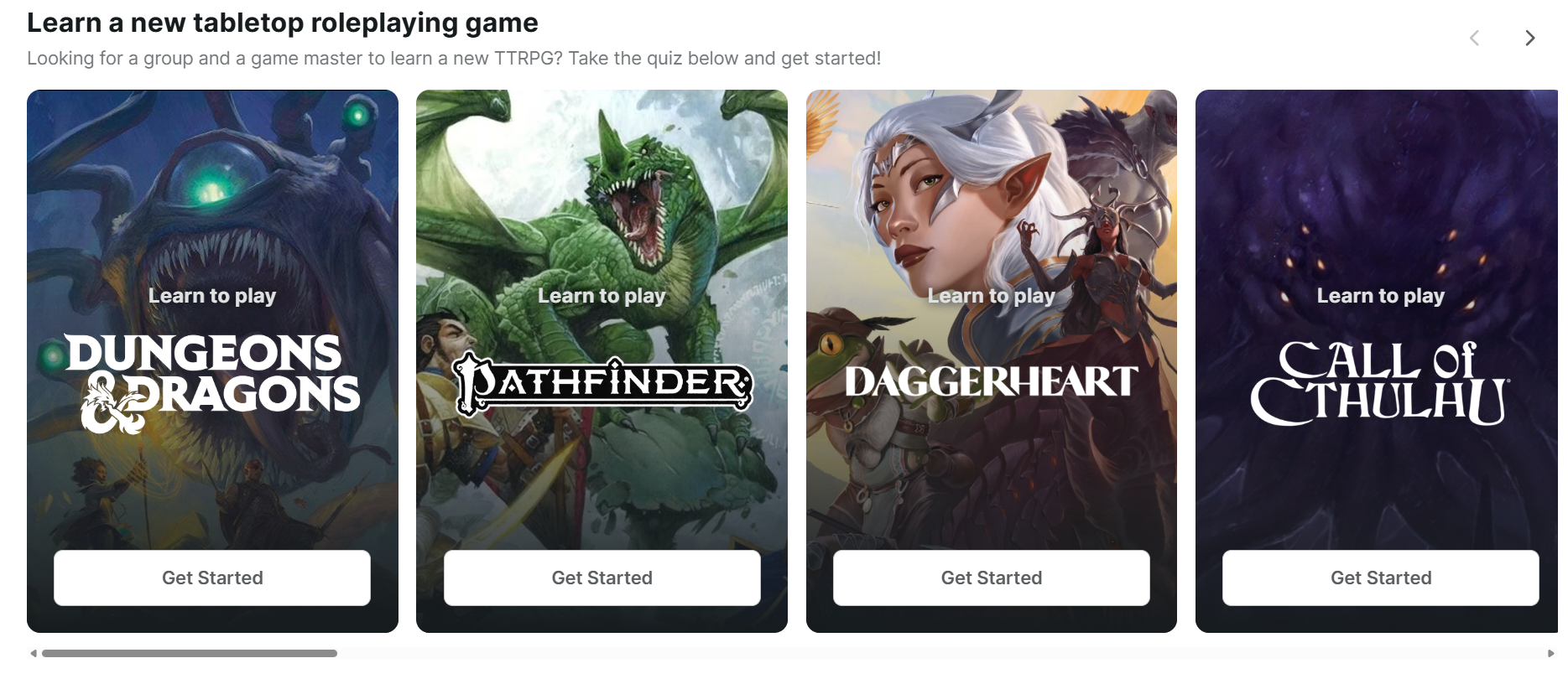 There’s Learn to Play quizzes for the most popular TTRPGs: Pathfinder, Daggerheart, Lancer, Call of Cthulhu, Shadowdark, Vampire: the Masquerade, good ol’ D&D, and many more.Â
